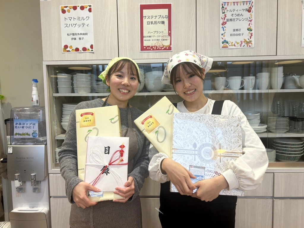最優秀賞のチームには賞金3万円とキノエネ醤油の調味料6本セット、ニューオークボのパスタセットが。審査員特別賞にはワインとキノエネ醤油調味料6本セット、ニューオークボのパスタセット。3位にはキノエネ醤油調味料3本セットとニューオークボのパスタセット、大瀬由生子先生の料理本が贈呈されました。