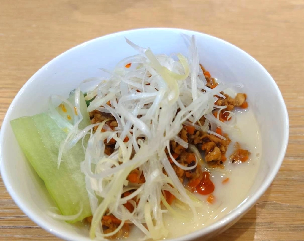 ポイント:肉を大豆ミートに、牛乳を豆乳にチェンジ。動物性食材を植物性食材に代え、環境にも配慮しつつ満足感のある担々麺に仕上げた。廃棄されがちな野菜の皮も使用して食品ロスにも貢献。