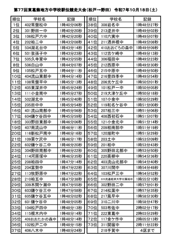 本日10月18日、第77回東葛駅伝が無事に開催されました!選手の皆さん、関係者の皆さん、お疲れ様でした!優勝は、流山市立常盤松中(昨年度2位)。準優勝は野田市立第一中(昨年度5位)、3位は松戸市立第六中(昨年度4位)です。おめでとうございます!