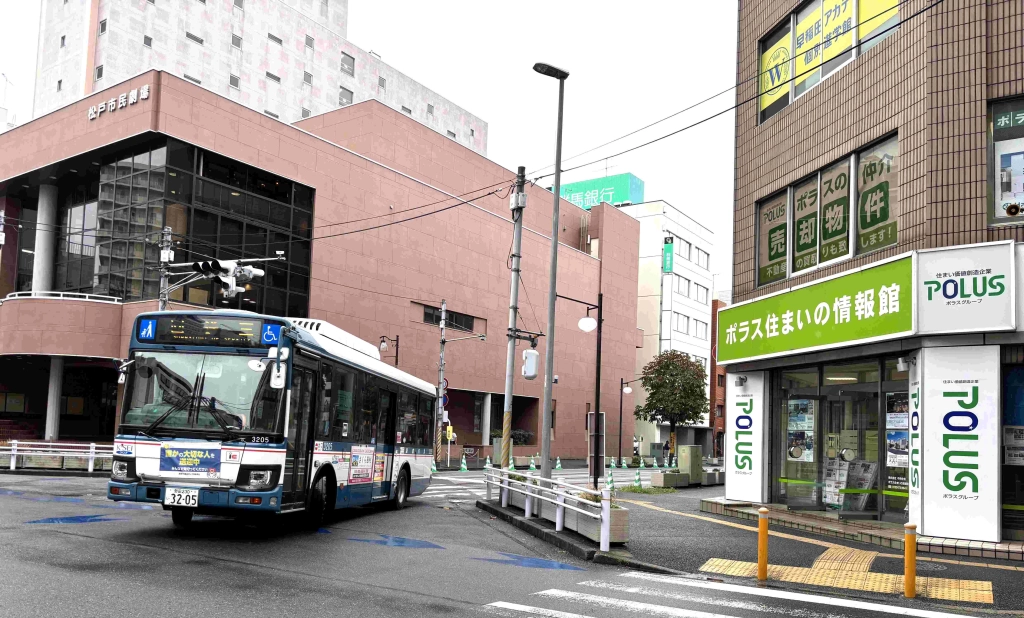 ポラスグループ ポラス住まいの情報館 松戸営業所店舗入り口(松戸市本町12-11秋本ビル1・2F JR松戸駅から徒歩3分)※スタート地点の松戸市民劇場の向いです。