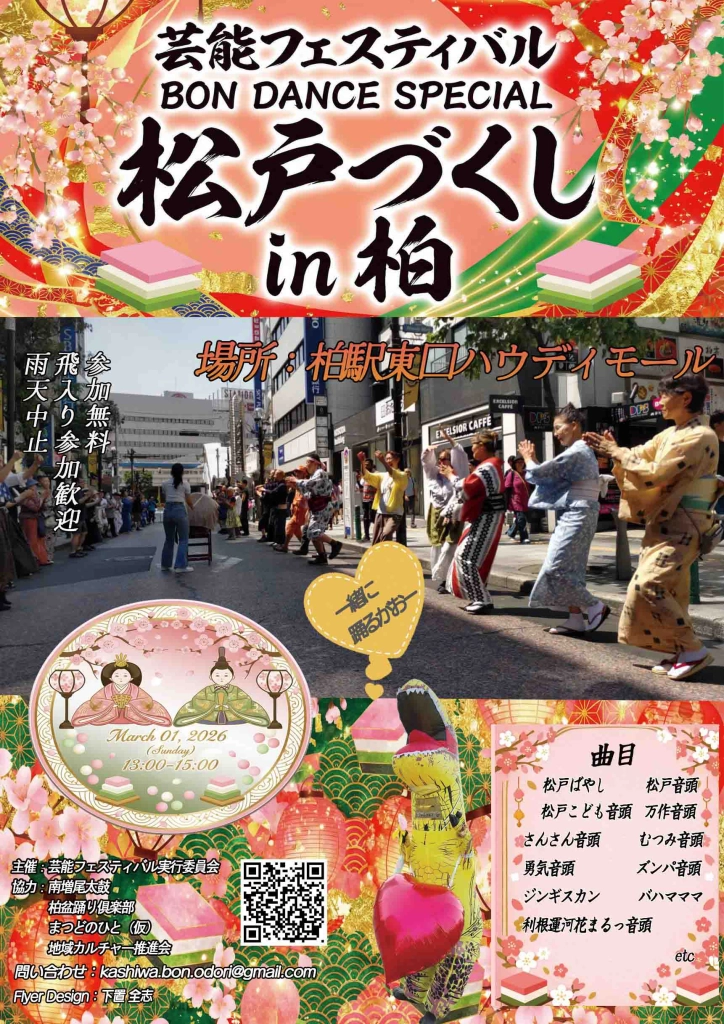 2026年3月1日(日)13時~15時。柏駅東口の駅前通り『ハウディモール』にて芸能フェスティバルBON DANCE SPECIAL 2026を開催。雨天の場合は中止。