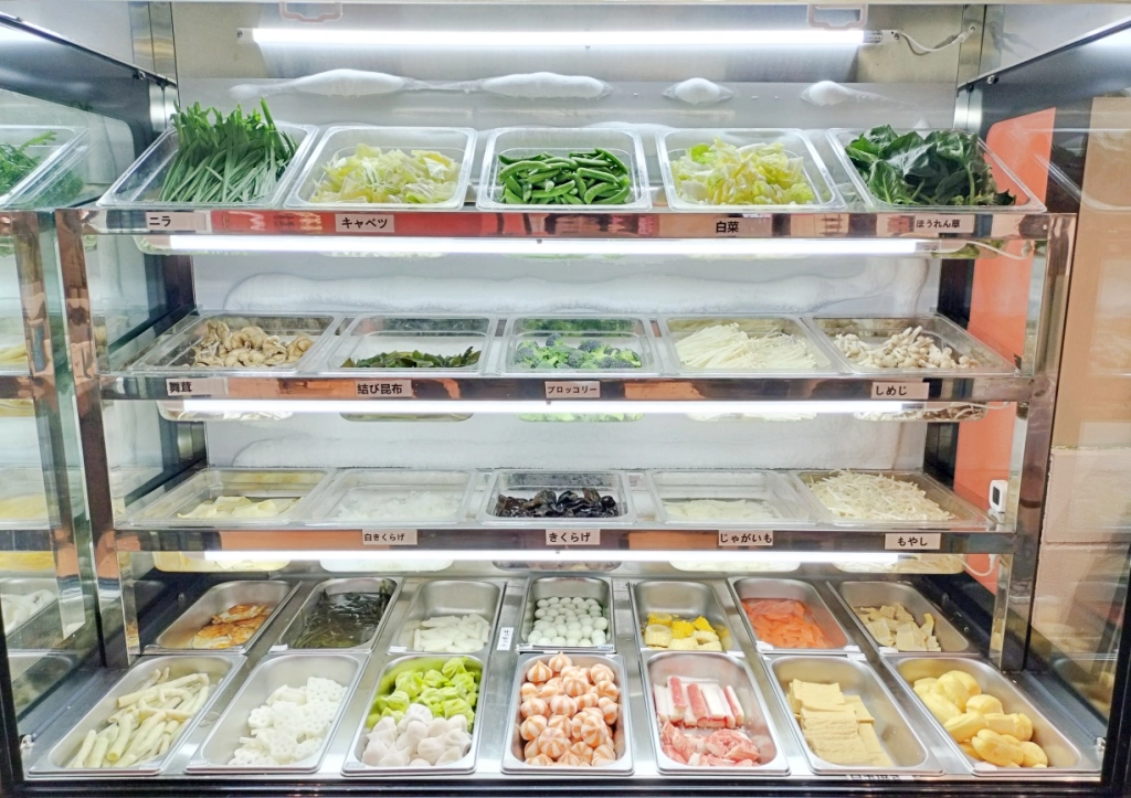 店内に陳列された野菜、きのこ、肉、海鮮など50種類を超える具材の中から、客自らトングで好みのものをボウルに取り、レジで会計。具材は1グラム単位の量り売り+ベースの麻辣湯スープと春雨480円(税別)。会計後に調理してくれ、好みに合わせた自分だけの『麻辣湯』が食べられる。