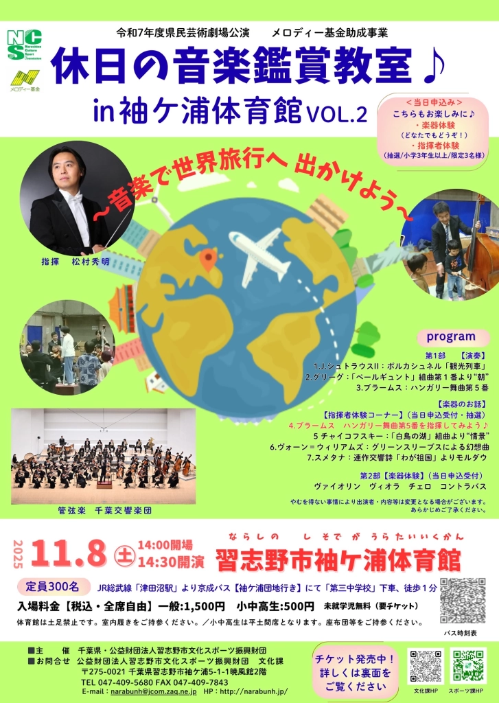 ▼会場:習志野市袖ケ浦体育館(⼟⾜禁⽌/要室内履き。幼⼩中⾼⽣は平⼟間席となるため、座布団などの持参を) 。