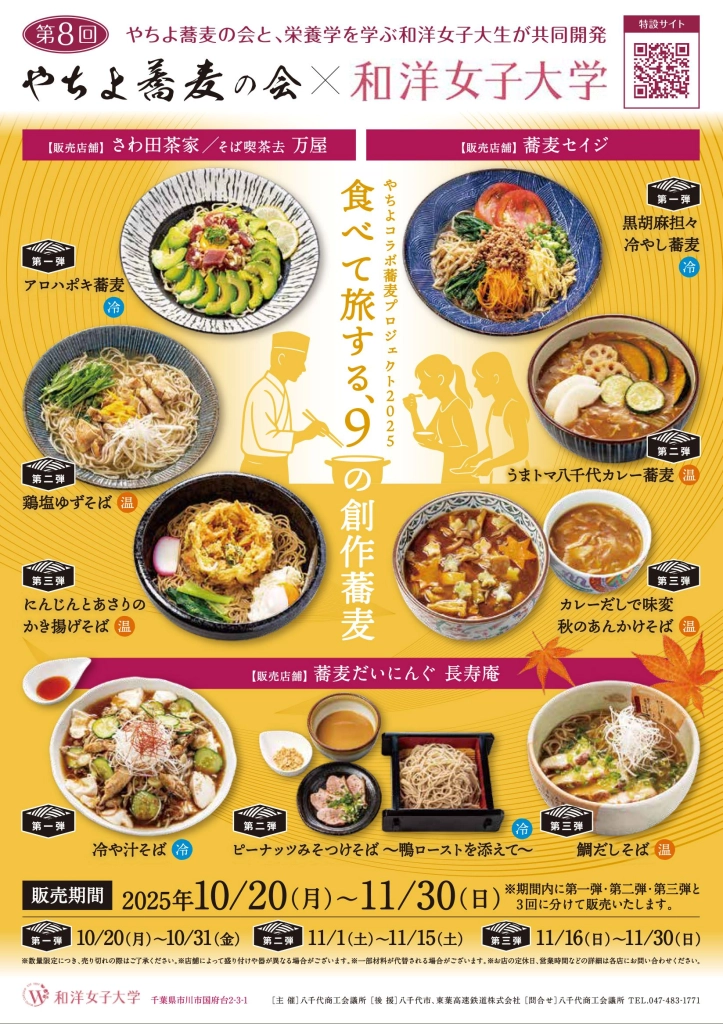 和洋女子大学(市川市)と八千代市内のそば店有志で組織する「やちよ蕎麦の会」による恒例のコラボレーション企画が、今年も実現した。同女子大学健康栄養学科3年の学生が、栄養学の知見と若者の感性を取り入れた創作蕎麦メニューを共同開発。全9品が10月20日から11月30日まで、市内のそば店4店舗で順次、期間限定販売されている。