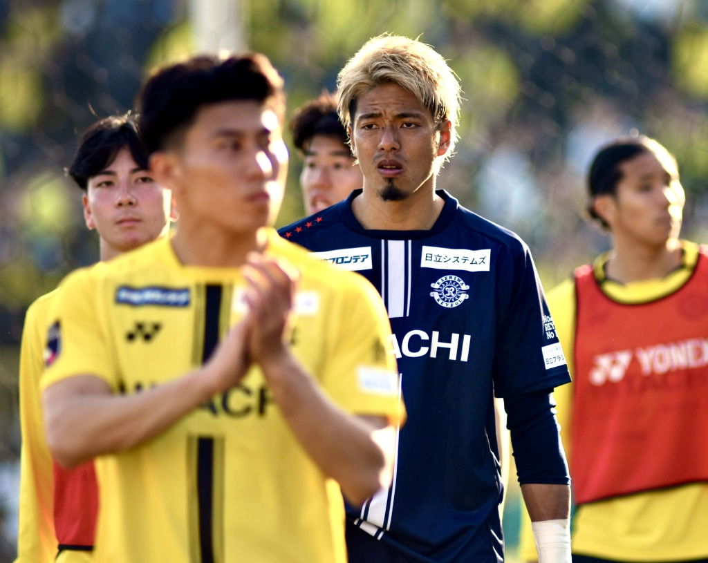開幕戦の雪はどこへやら、永井を照らすかのような陽光が差し込む三協フロンテア柏スタジアム。レイソルサポーターたちが叫ぶ、万雷の「永井コール」に力ずくで包まれるように登場した永井。ゴールマウス内での立ち姿も勇ましかった。