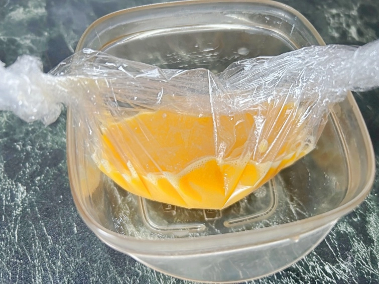 ❸タッパーにラップを大きめにしいて、❷を入れたらラップの端をくるくると折って、両脇をねじる。