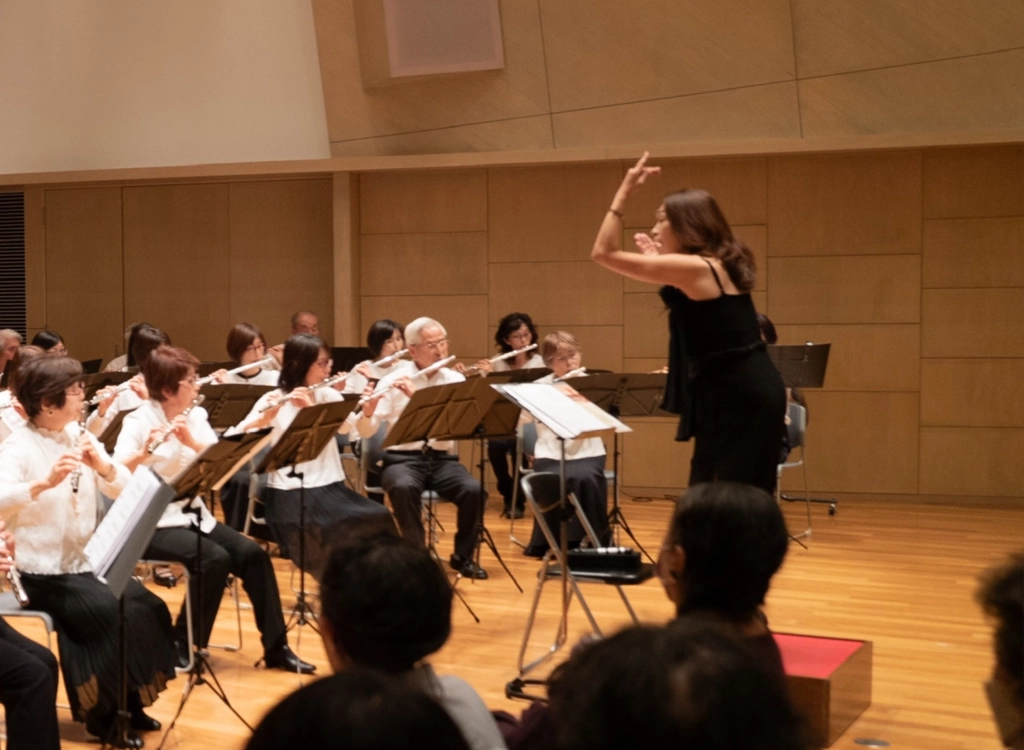 指揮者の渡部先生は「フルートの人口を増やしたい。ひとりでも多くの方に始めてほしい。基礎練習が大切。自分の音に集中して、その後に他人の音を聞く」と解説。練習中に「もっと音に色を付けて、音が抜けないように、音の流れを意識して」とフルートを吹きながら、細かい指示を次々と繰り出す。団員の様子を感じ取り、ポジティブな方向へと導く。