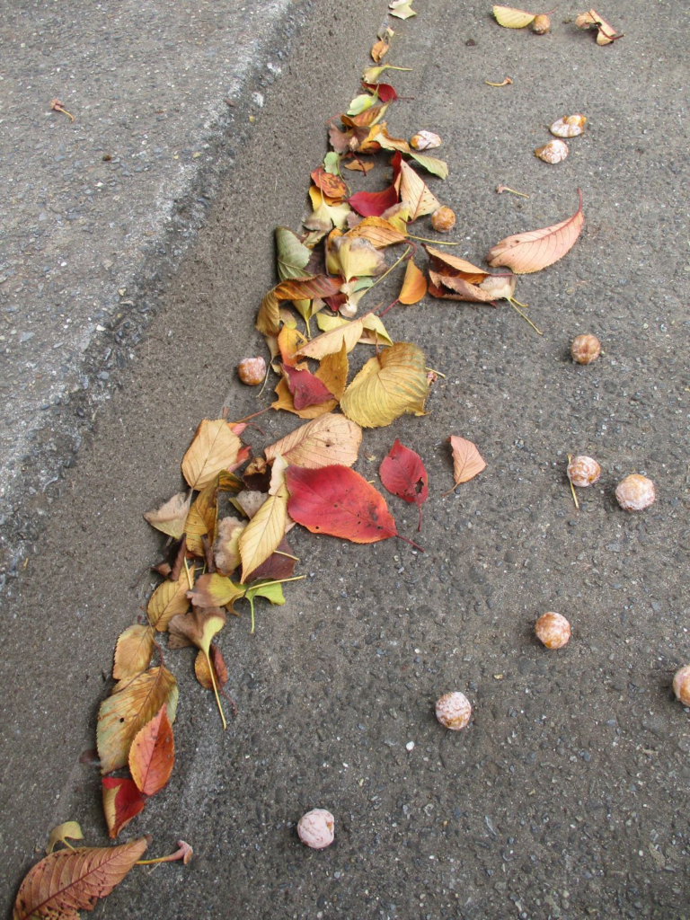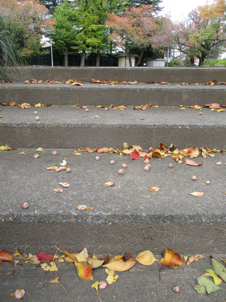 右へ曲がると公園があった。昼の公園は静かだ。紅葉が始まっていた。銀杏の実が階段に落ちている。独特のにおいだ。色鮮やかな落ち葉も目を楽しませてくれる。