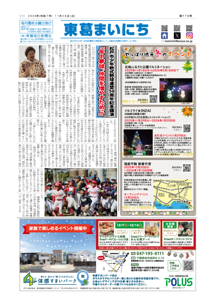 東葛まいにち新聞は毎月最終水曜日発行。毎日新聞に折り込みの他、ファミリかしわ3階柏市観光案内所「まるっと柏」、モラージュ柏、柏髙島屋本館B2階(和洋酒売り場側エレベーター横)、パレット柏、道の駅しょうなん、我孫子アビシルベなどにも設置しています!広告掲載のお問合せもお気軽に!