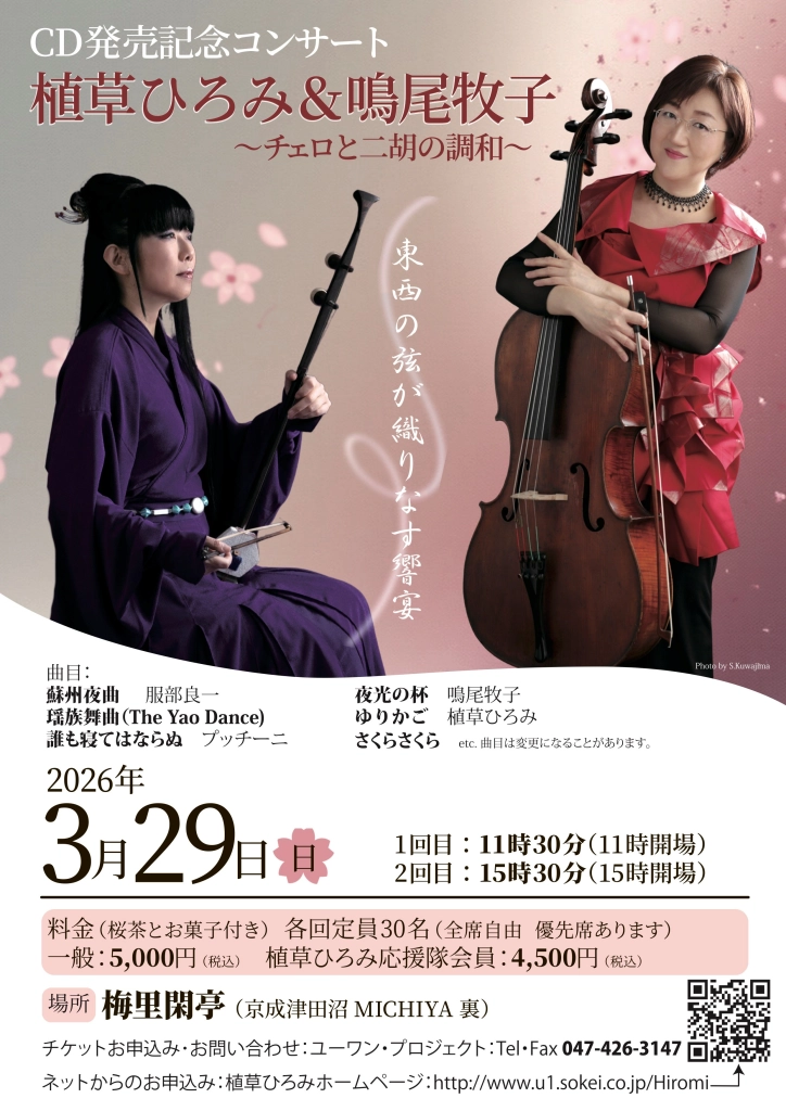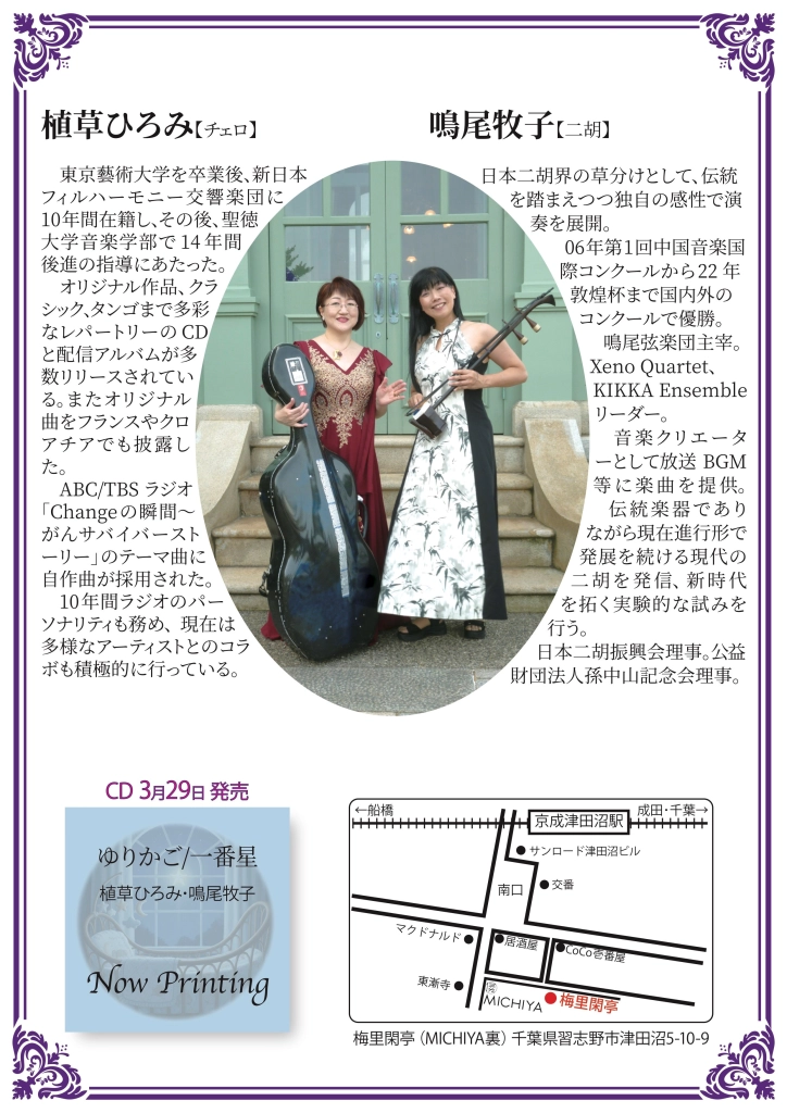 船橋市在住のチェリスト、植草ひろみさんと関西在住の二胡奏者、鳴尾牧子さんの協演によるCD「ゆりかご 一番星」が3月、発売になる。発売記念コンサートが3月29日(日)京成津田沼駅近くの「梅里閑亭(ばいりかんてい)」で開かれる。