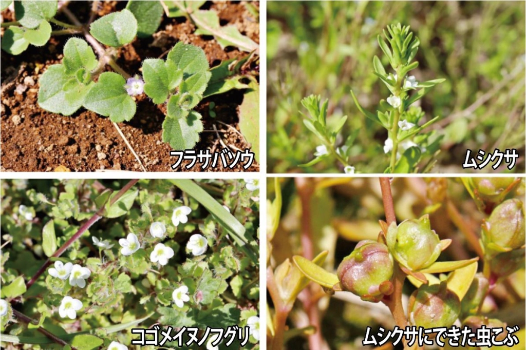 もうひとつ水辺や湿った場所にはムシクサが生えています。ムシクサは茎が立ち上がり、春に白い小さな花を咲かせます。ゾウムシの仲間がつぼみに卵を産み、丸い虫こぶをつくることがあるので、こういう名前がつけられました。
